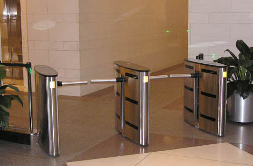 Drop arm barrier optical turnstiles shown here are installed at a corporate headquarters. These simple barriers act as a strong visual cue to users, reducing the need for staff intervention and the frequency of alarms. Compact housings help maintain an open look.
