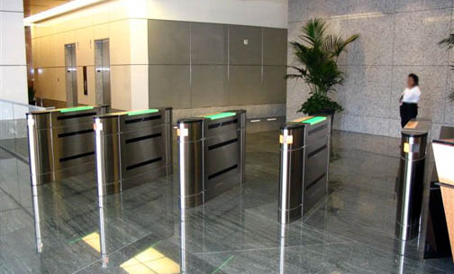 A non-barrier/barrier upgradeable version of the 60×09" turnstile is shown here with custom top panel lighting. These units are installed in the lobby of a high profile corporate headquarters. To reinforce the corporate image, the customer's logo is etched inside a stainless steel ring the top surface of the turnstile to mark the location of the concealed proximity card reader.
