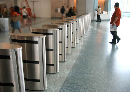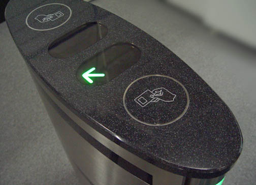 Top view of housing, with stainless steel sides and end caps, and Corian top. Note the card readers for both directions, indicated by symbol etched into Corian, within a flush stainless steel ring. Arrow indicator is illuminated by LEDs below a diffusion film.