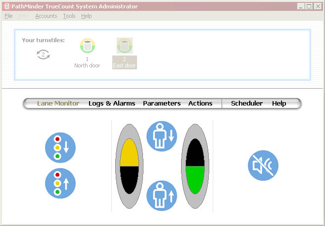 Basic lane control is available on the Lane Monitor screen. At left, controls for opening and closing lanes. In centre, a larger lane indicator with controls for permitting a guest (without badge) to enter. At right, a control to clear alarms.