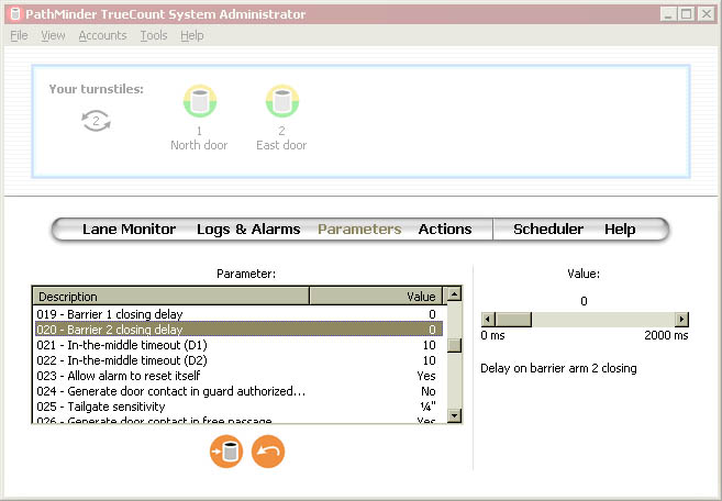 ![]() The Parameters screen is used for tuning and programming the turnstiles. Available parameters vary by turnstile model. Controls for changing values (at right) are touch-screen friendly, with plain english description of the selected parameter. User can save and load parameter values to/from a file on disk to maintain consistency among lanes. |